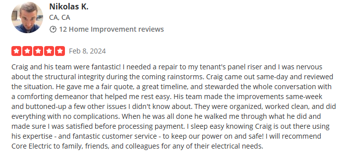 At Core Electric, professionalism, integrity, and customer care are at the heart of everything we do. Since 2009, we’ve been providing reliable electrical services across San Diego, earning the trust of homeowners and businesses through our commitment to safety, quality, and honest pricing.